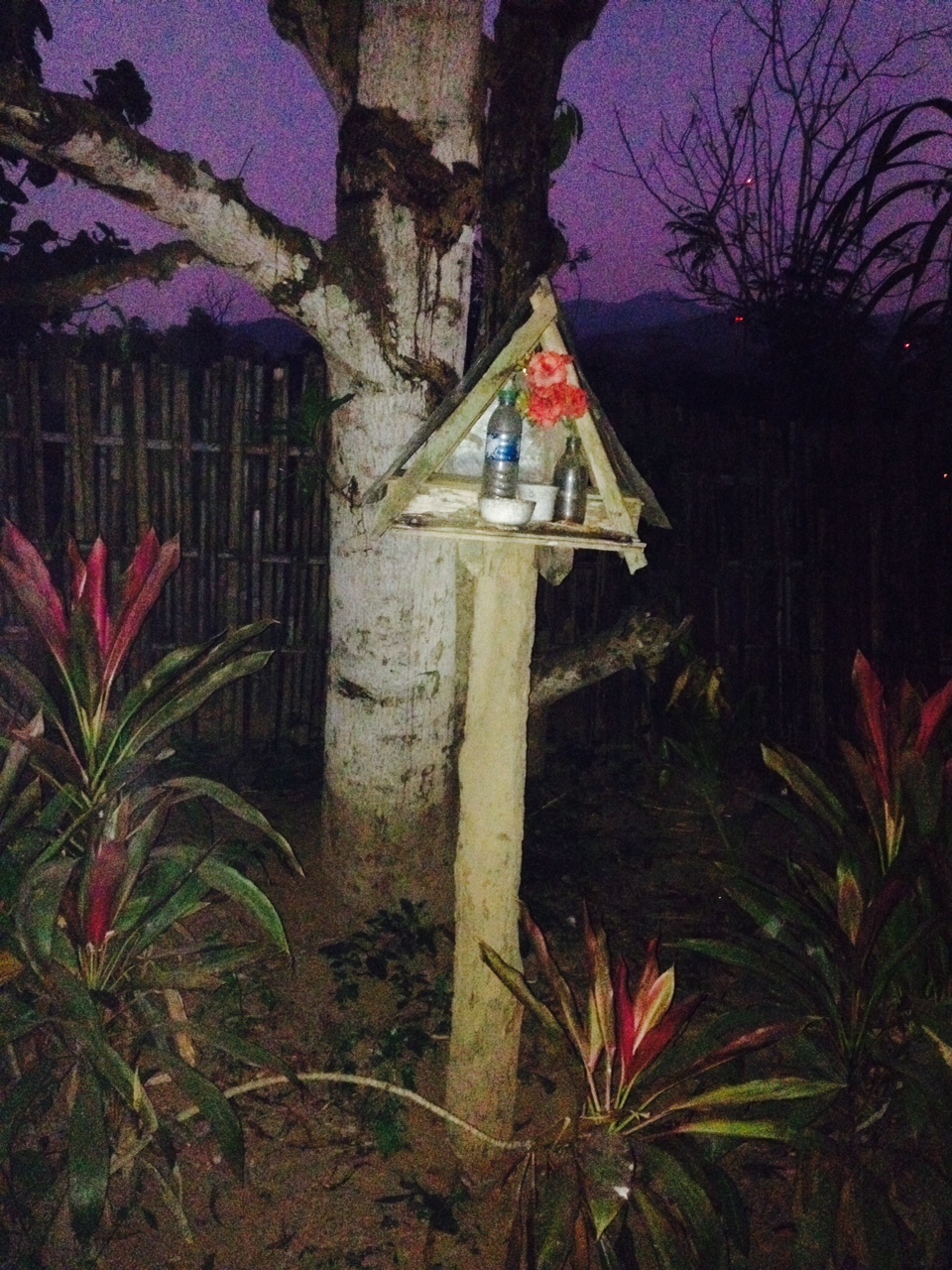 We got out our smart phones and showed them pictures of MN. I didn’t need much Karen to explain a picture of me with a snowman. We ended up sitting on their porch watching a Thai soap opera that somehow included vampires, I think. Time passed — it got dark. The family’s spirit house in their front yard was starting to look a little creepy to me as the full moon rose up behind it.