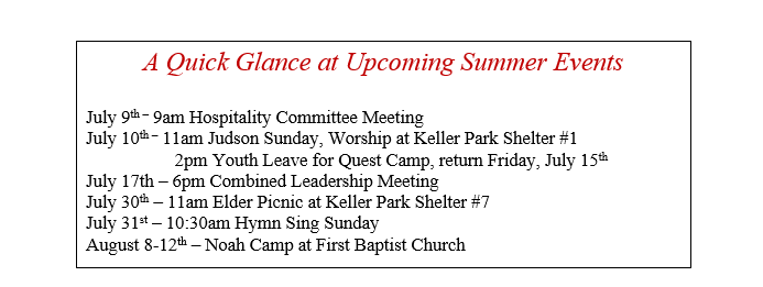 The newly formed Care Ministry Team is planning their first event this summer – a picnic at Keller Park especially for elders and their friends and family. We know that many of our elders often feel lonely and isolated – especially since the pandemic – so this is a time especially for them to get together with others and enjoy some time of fun, food and fellowship. This picnic will be on July 30th and everyone is invited – but with elders as our guests of honor. We will have more information coming soon.