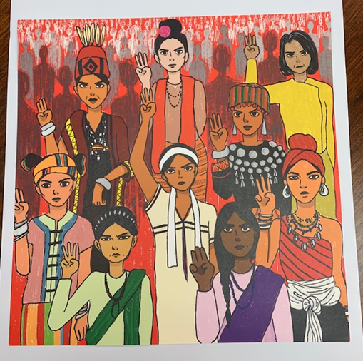 “I created this piece to recognize the women in Myanmar who stand in solidarity with the Civil Disobedience Movement. Lives have been lost at the hands of their own government but despite the risks, our mothers and sisters have been at the forefront of the movement. Whether they are leading the protests, tending the wounded, providing water, or protecting the protest zones, their efforts all count towards the liberation of the people in Myanmar.” Eh Soe Dwe