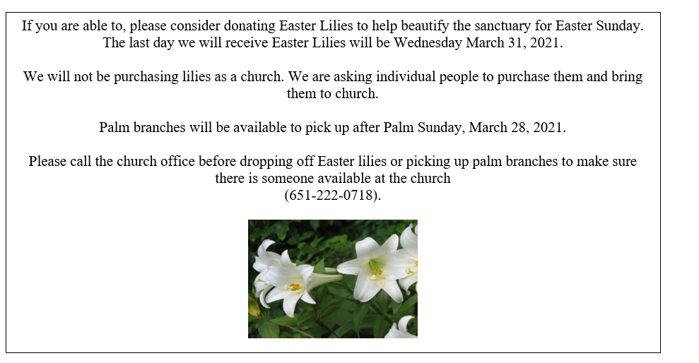 Pastor Bill was out of town, so I immediately when to church and started calling church leaders for an emergency meeting the next day to decide what to do about church. There was still so little we knew at the time. But we decided to honor the governor’s warning and we cancelled church. In a subsequent meeting we decided to not have services for ten weeks in accordance with CDC guidelines. It was a heartbreaking decision. We couldn’t imagine not coming together to worship for that long. But, of course, that was only the beginning. Here we are nearly a year later and we still aren’t back to normal. As I write this over 450,00 people have died of coronavirus in the United States and over 6,300 have died here in Minnesota. Those numbers are still just difficult to comprehend – the loss of all those lives is overwhelming.