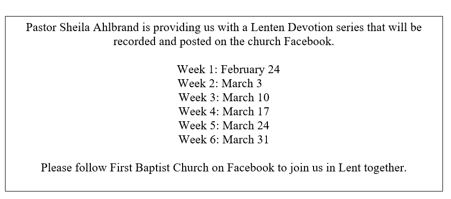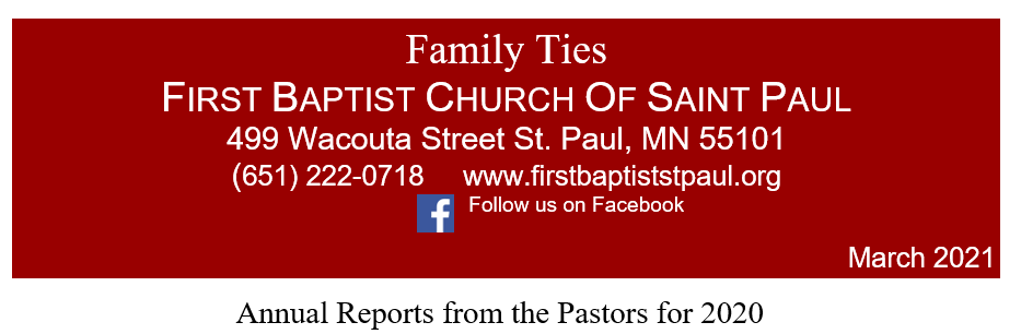 Sometimes it is easy to forget that a year ago things were very different than they are now. The church was busy and thriving in wo many ways. I was personally involved in two projects that had me very excited about the future of First Baptist. In 2019 I started a mentorship program working with four young adults from our congregation and in early 2020 I was seeing the fruits of that program as I watched these enthusiastic young people take turns teaching and leading our youth Sunday School and TLC group. It was such a joy to watch them and it gave me such hope and confidence for the future.