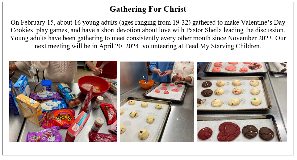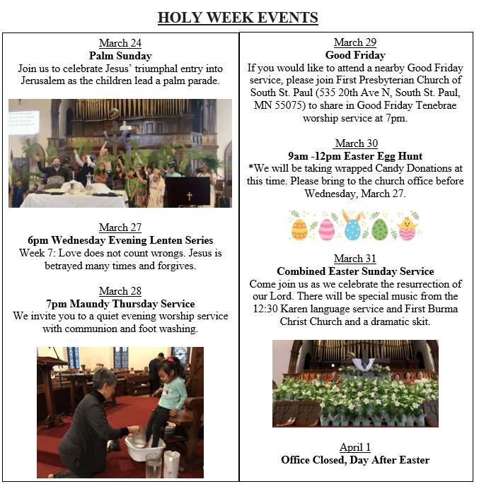 This year Ash Wednesday – which marks the beginning of Lent – was on the same day as Valentine’s Day. This seemed like a reminder that Lent can be seen as a season of love – because Jesus’ life, death, and resurrection were all gifts of love. On Wednesday nights Pastor Sheila offered a series of Bible studies titled “The Days of Love and Lent.” Each week we gathered to look at the last week of Jesus’ life through the eyes of love – talking about the different events of that week and how they match up with the characteristics of love listed in I Corinthians 13:4-7.